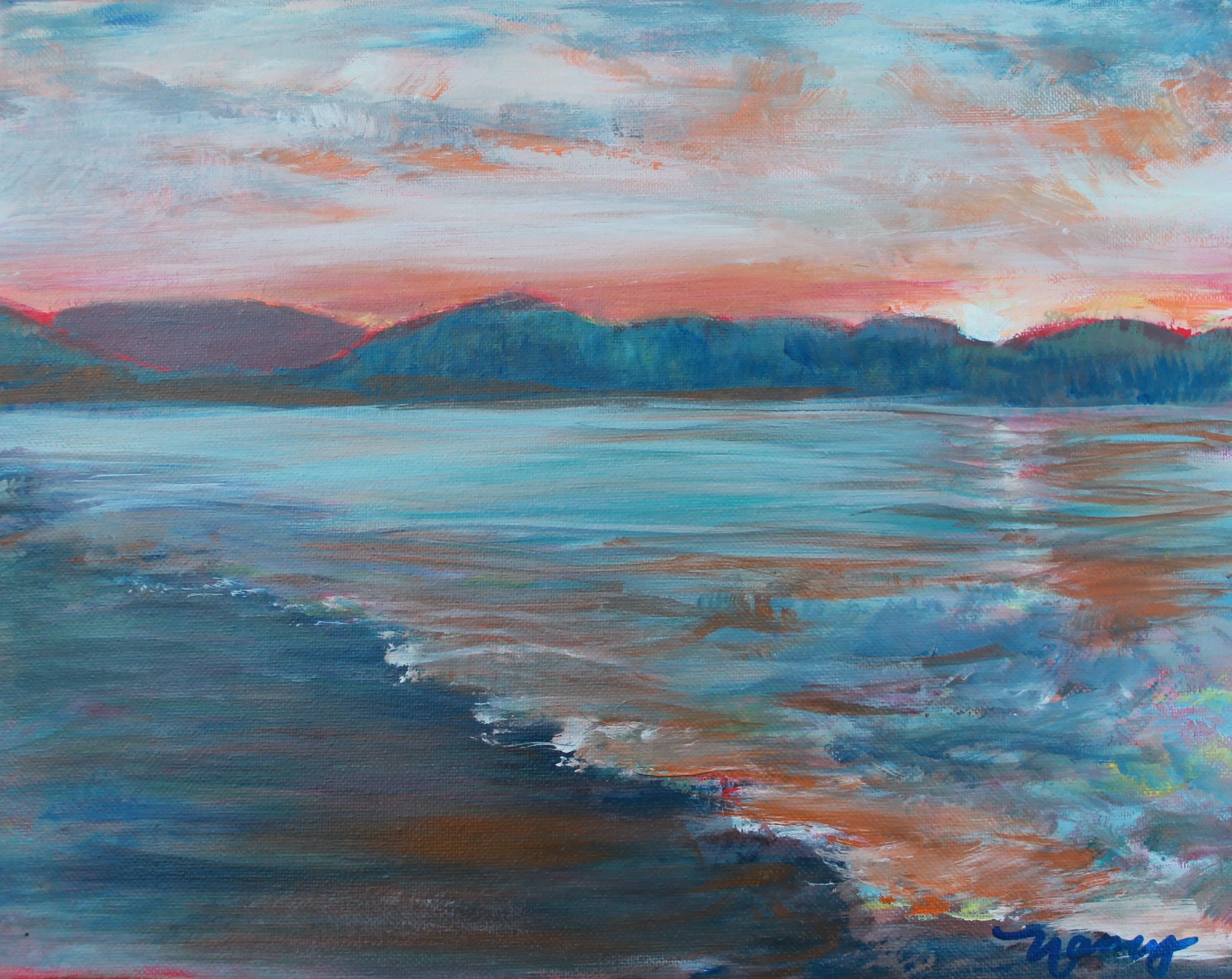 Sun Over Cowlitz Bay, 2024. Acrylic on canvas board, 8 x 10". Sold.